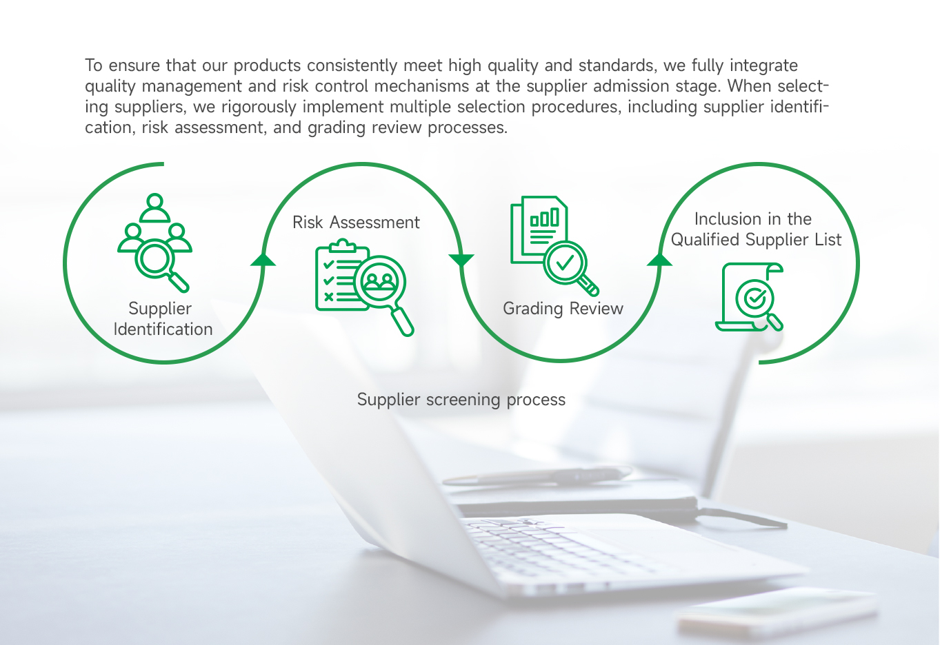 We uphold the procurement principles of "Legal and Compliant, Transparent, and Quality First," continually enhancing our supply chain system. Our goal is to build a mutually beneficial and win-win value chain ecosystem, promote the development of a responsible value chain system, and contribute to a more sustainable industry ecosystem.