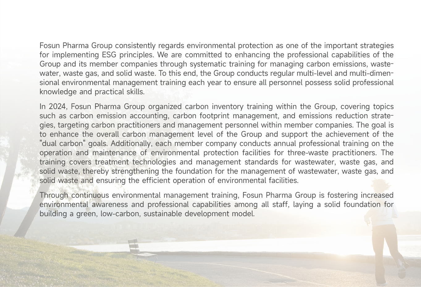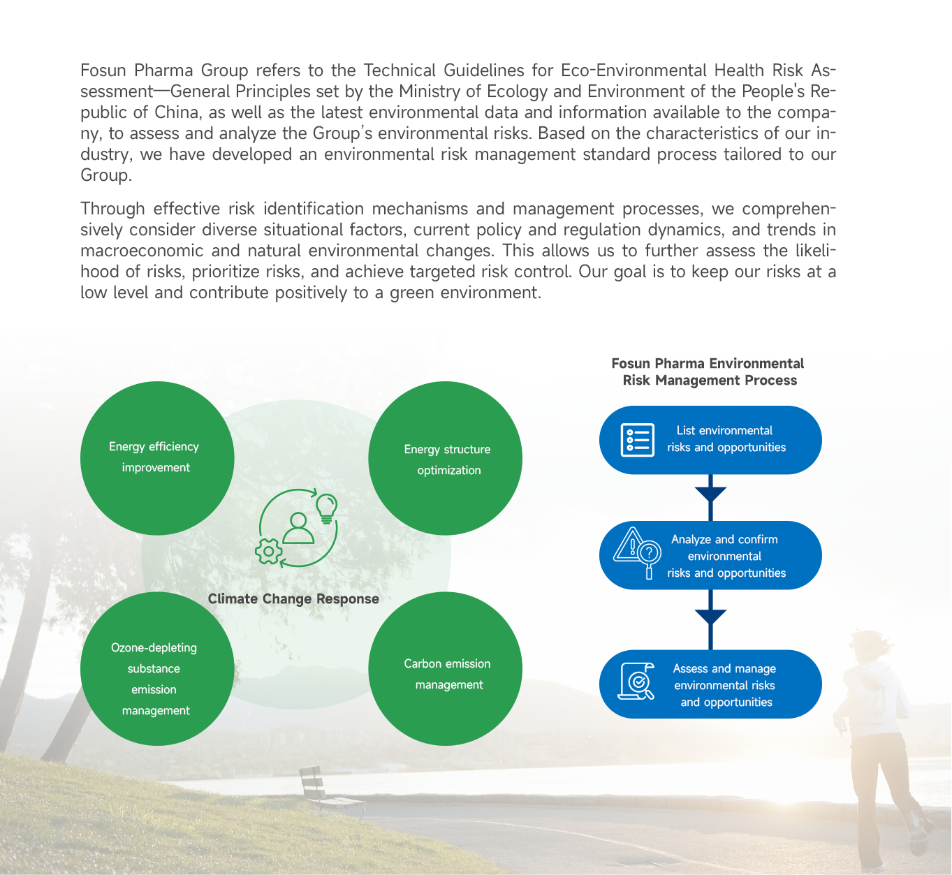 The Board is the highest authority within Fosun Pharma for the topics of "Climate Change Response" and "Environmental Management", with the ESG management system fully responsible for the supervision, decision-making, management, and implementation of relevant initiatives. Furthermore, the Group has incorporated objectives and indicators related to "Climate Change Response" and "Environmental Management" into the performance evalsuation frameworks for senior management, with a weight of no less than 5%.