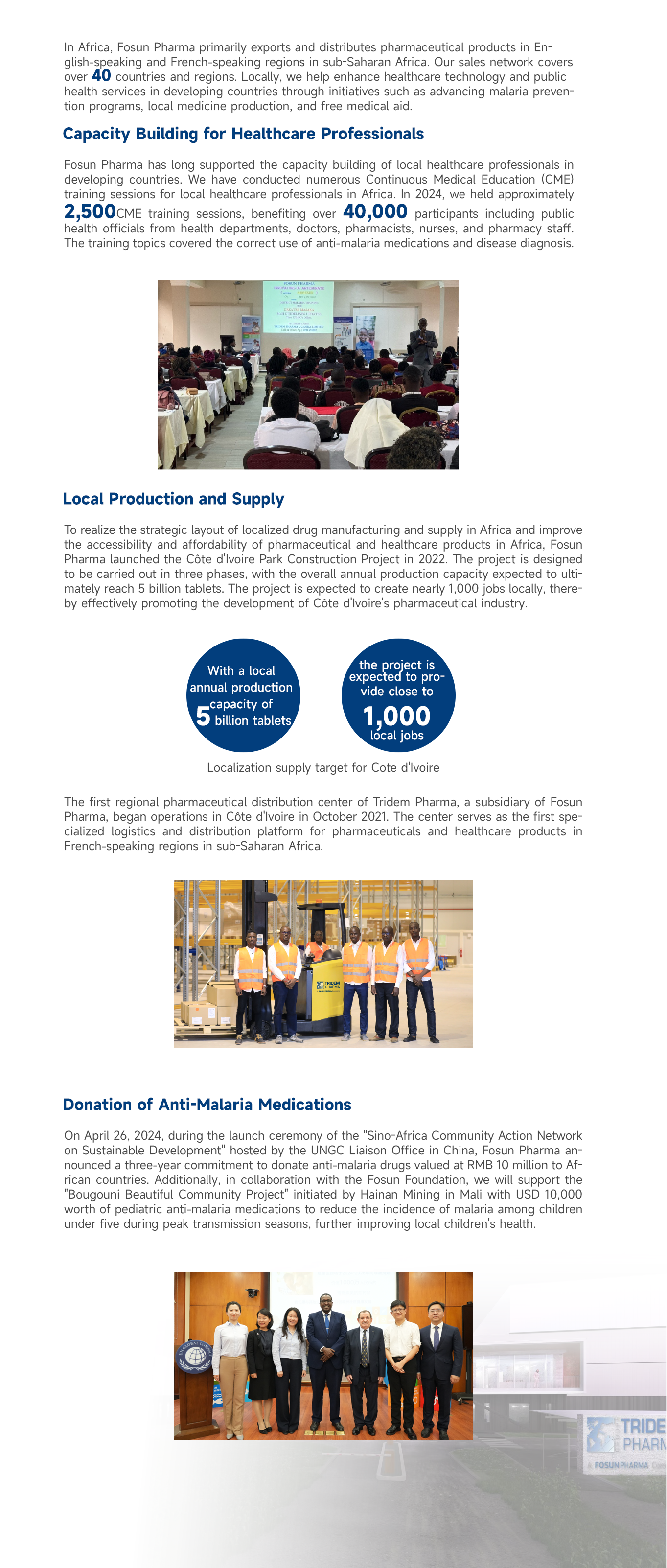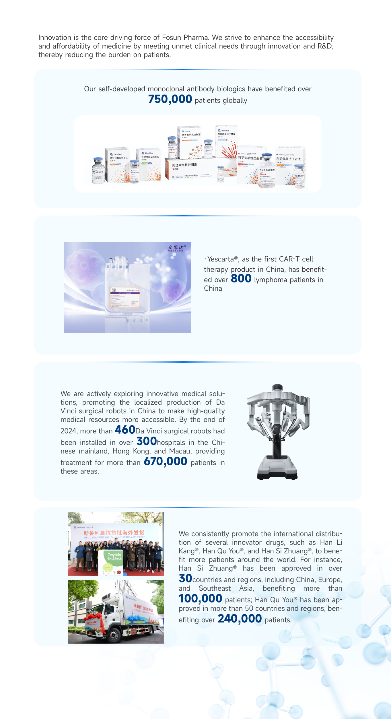 Fosun Pharma regards innovation as the most important social responsibility in sustainable corporate development. Focosing on unmet clinical needs, the company promotes the launch of more accessible and effective innovative products to benefit patients through continuous innovation. Additionally, we support public health capacity development in developing countries and strive to advance equitable access to healthcare worldwide.