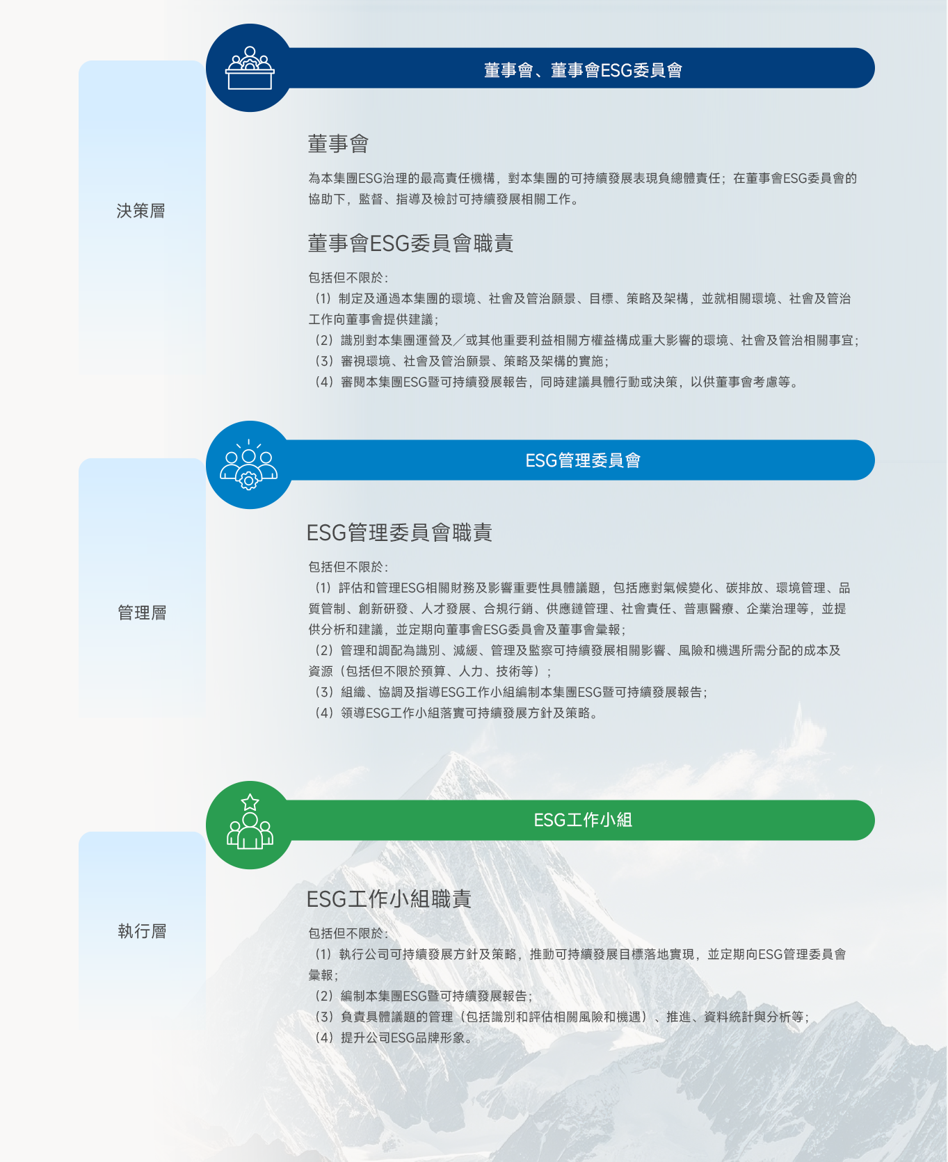 復星醫藥集團構建了由董事會及董事會ESG委員會、ESG管理委員會、ESG工作小組組成的ESG治理架構,以確保董事會及管理層對可持續發展的有效監管、科學指導及全力支援。